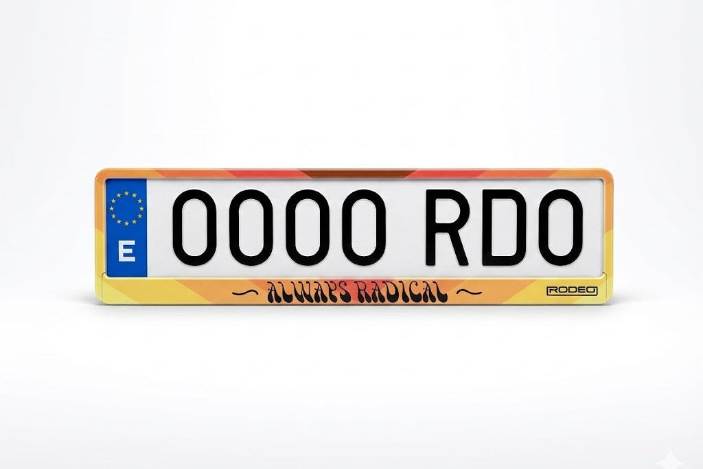 Diseño en tonos cálidos que recuerdan a una puesta de sol, con la frase “Always Radical” para quienes marcan estilo sin filtro. Este portamatrículas decorativo está fabricado en material resistente y es compatible con coches europeos.